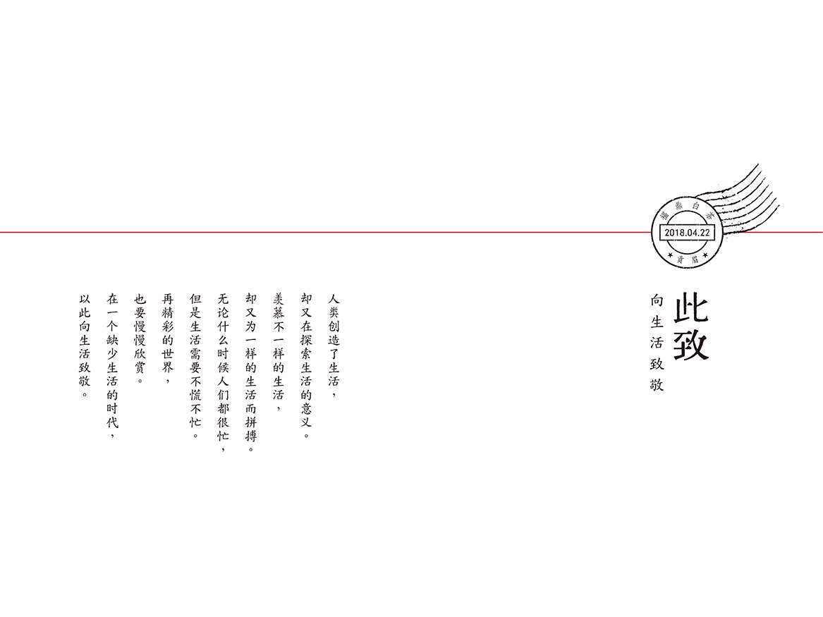 《向生活致敬》——此致人類創造了生活,卻又在探索生活的意義。羨慕不一樣的生活,卻又為一樣的生活而拼命。無論什么時候人們都很忙,但是生活需要不慌不忙。再精彩的世界