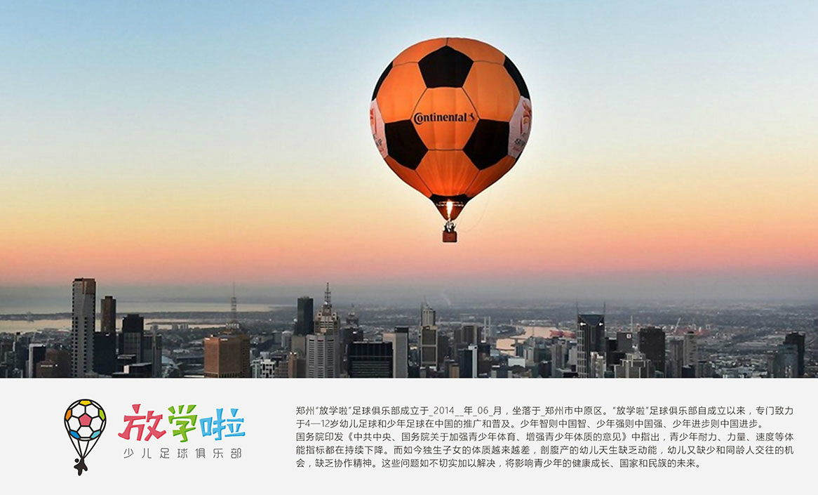鄭州“放學啦”足球俱樂部成立于2014年,坐落于鄭州市中原區(qū)。“放學啦”足球俱樂部自成立以來,專門致力于4—12歲幼兒足球和少年足球在中國的推廣和普及。本著快樂