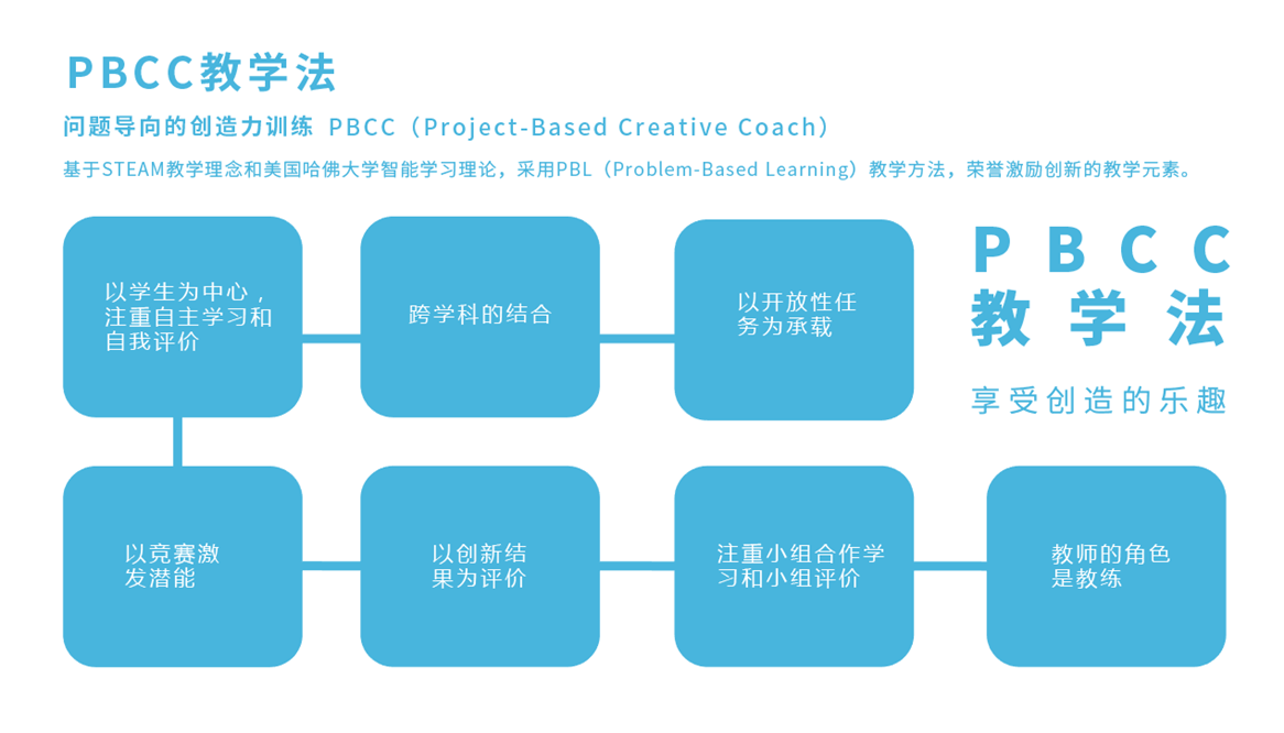 通過探究性+實(shí)踐性+跨學(xué)科+項(xiàng)目式教學(xué)方式,打造問題導(dǎo)向性的創(chuàng)造力訓(xùn)練品牌專家。通過科學(xué)落地、實(shí)用實(shí)效的 PBCC教學(xué)法,讓創(chuàng)造力教育易教樂學(xué),讓素質(zhì)教育回歸本源。