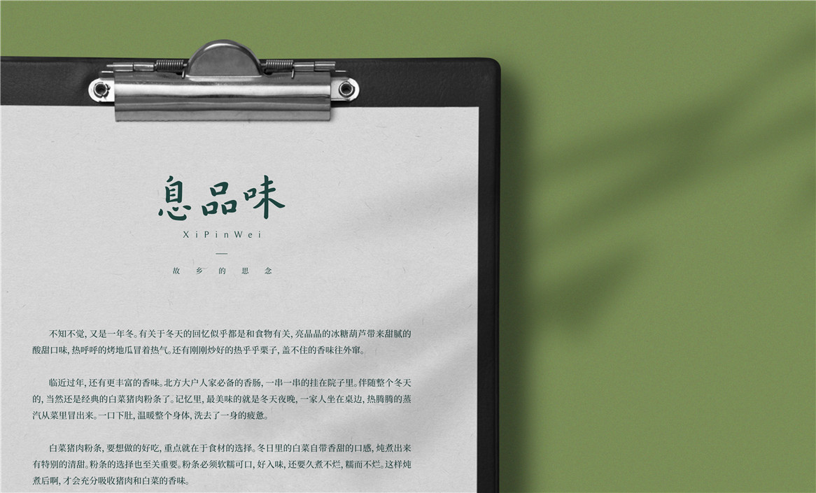 息縣,隸屬素有“江南北國,北國江南”之稱的信陽市,地跨淮河南北,四季分明,氣候濕潤,環(huán)境宜人,處處彌漫著自然的氣息。所以我們在為息品味進行品牌形象塑造時,盡量保持本真、自然的態(tài)度,不去刻意設計修飾,體現(xiàn)出弘一大師字體骨子里那種靜而不躁,文而不野,潤而不枯,簡而不繁的藝術境界,整體上呈現(xiàn)出樸實無華、自然本真的氣質(zhì)。