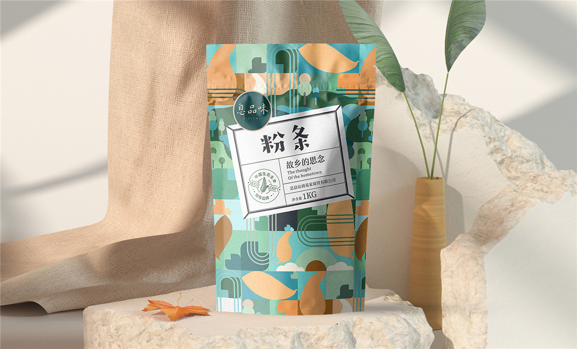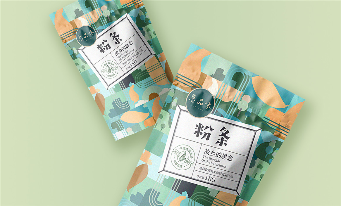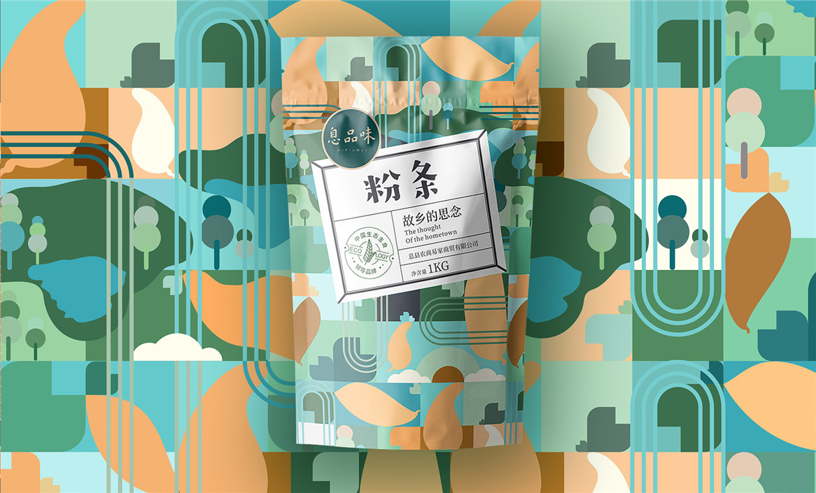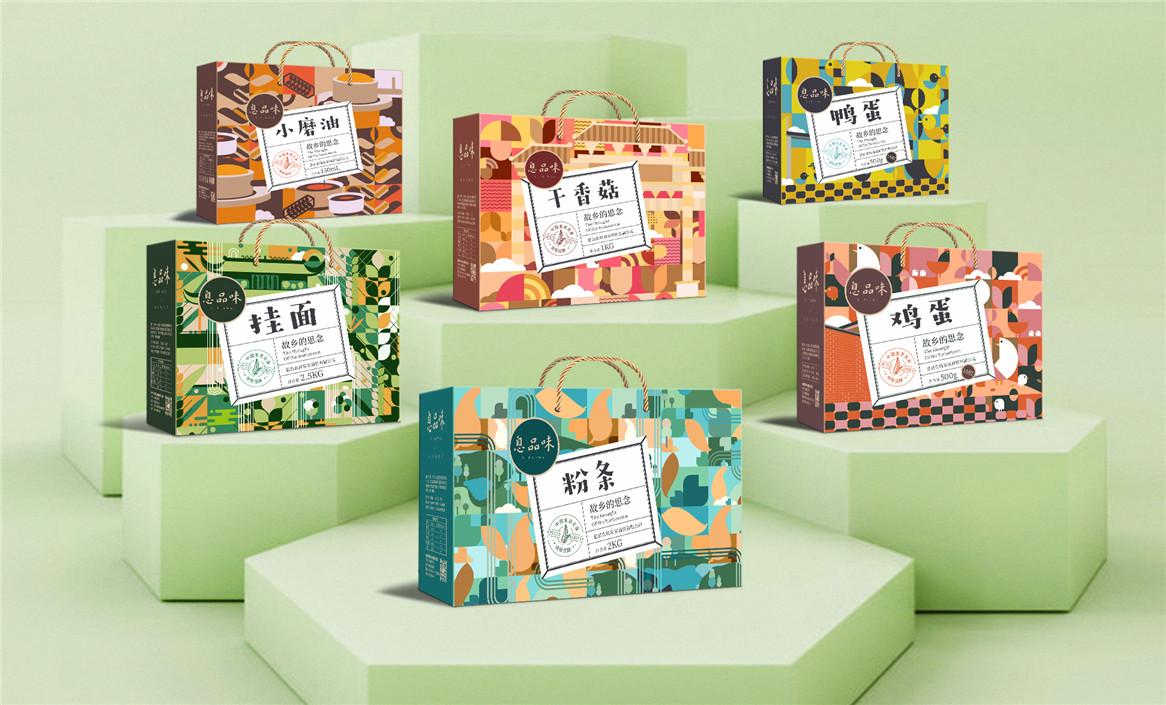 以“故鄉(xiāng)的思念”為品牌溝通語言,從息品味產(chǎn)品生態(tài)特征,地域代表文化、當?shù)孛袼酌耧L等提取包裝設計元素,以平面幾何形態(tài)的方式把產(chǎn)品、產(chǎn)地、相關文化特征進行符號化設計視覺表達,用一種與當下農(nóng)副產(chǎn)品市場不同的包裝表現(xiàn)方式設計,展現(xiàn)綠色新生活,迎合當下消費升級審美升級的新消費趨勢,快速建立品牌認知。