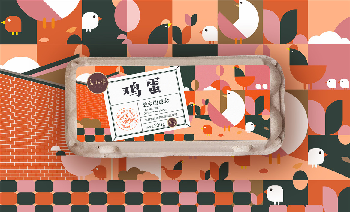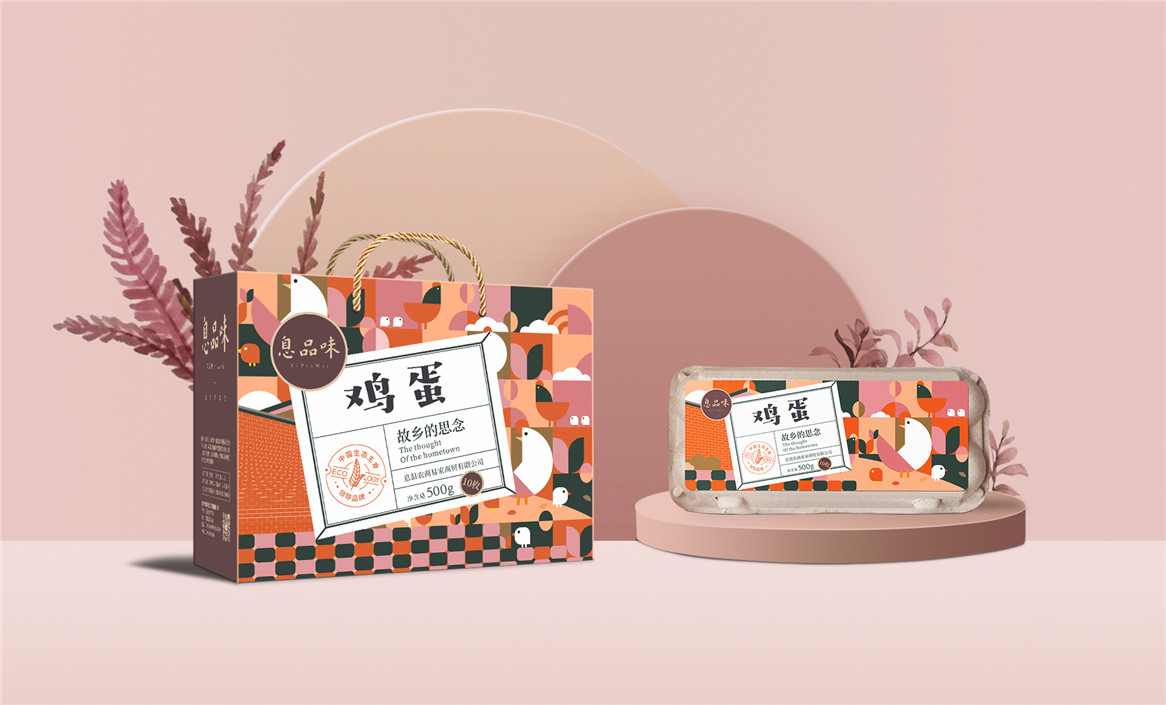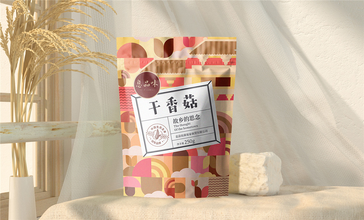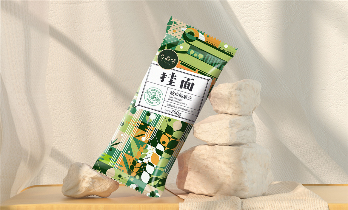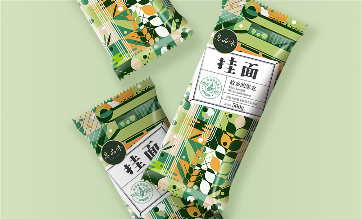 以“故鄉(xiāng)的思念”為品牌溝通語言,從息品味產(chǎn)品生態(tài)特征,地域代表文化、當?shù)孛袼酌耧L等提取包裝設計元素,以平面幾何形態(tài)的方式把產(chǎn)品、產(chǎn)地、相關文化特征進行符號化設計視覺表達,用一種與當下農(nóng)副產(chǎn)品市場不同的包裝表現(xiàn)方式設計,展現(xiàn)綠色新生活,迎合當下消費升級審美升級的新消費趨勢,快速建立品牌認知。
