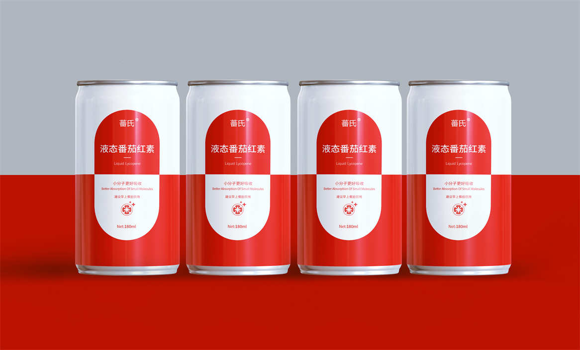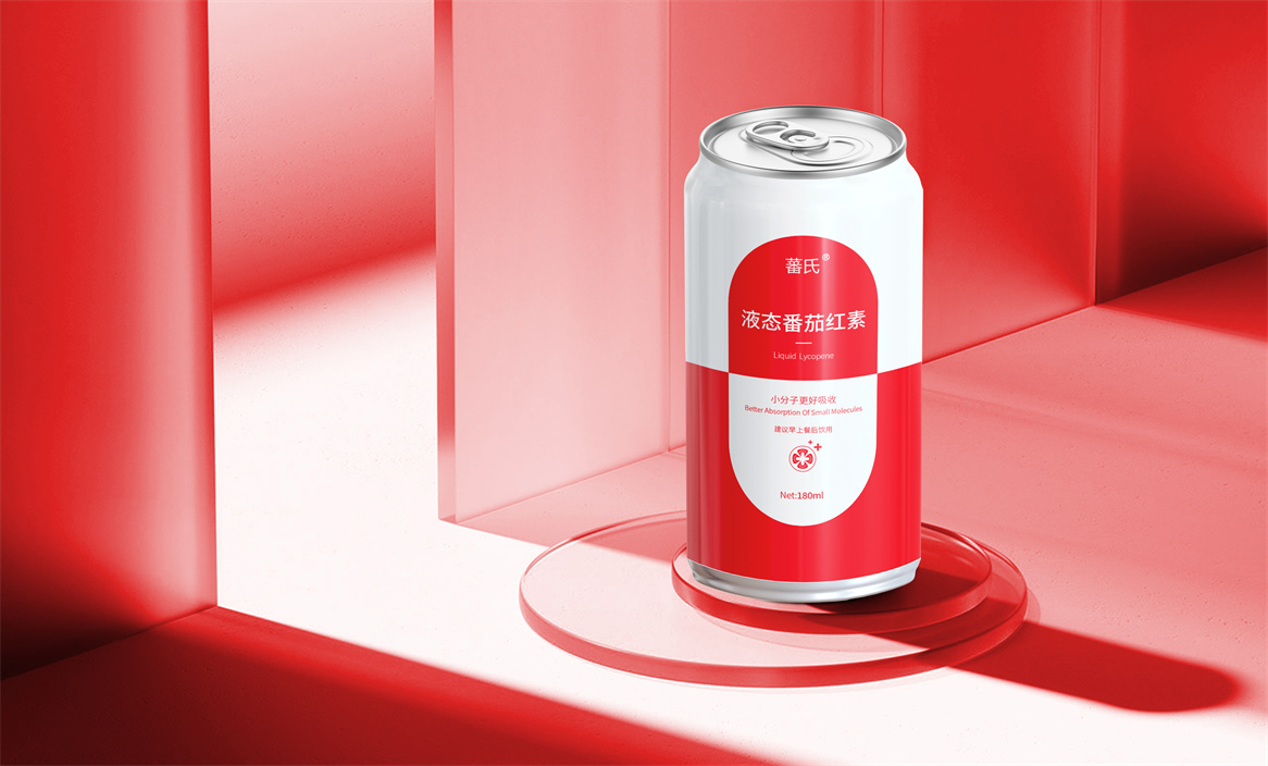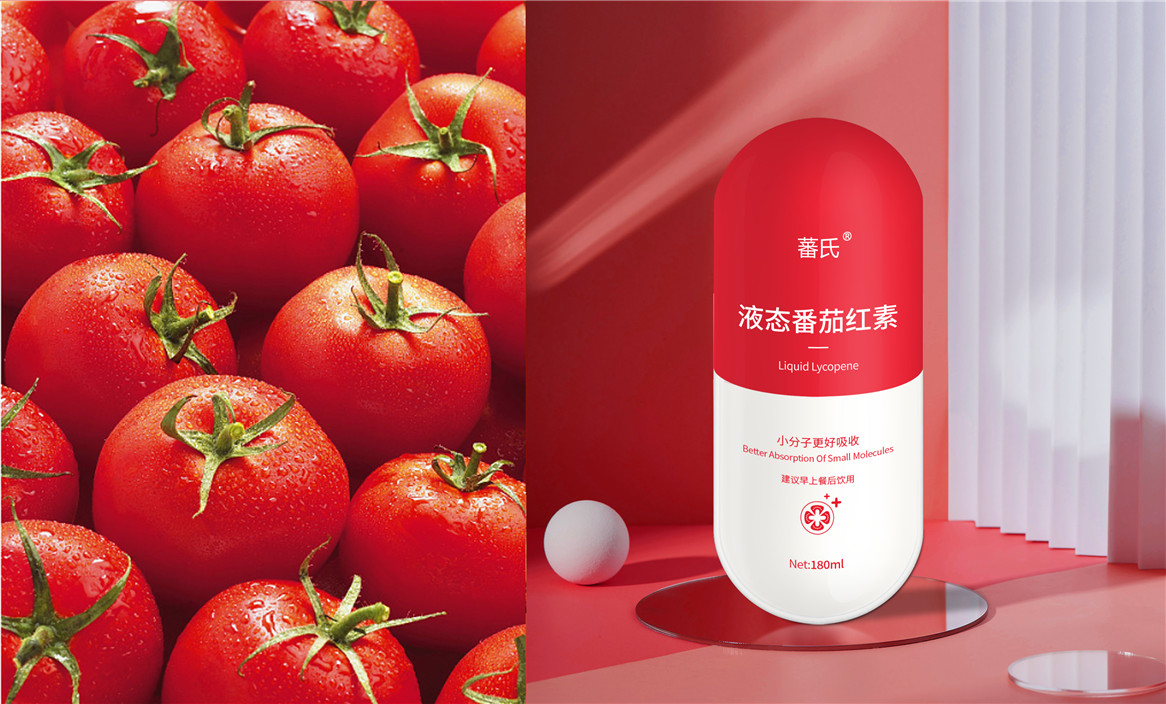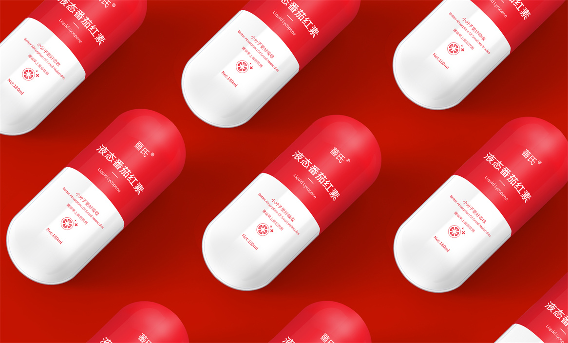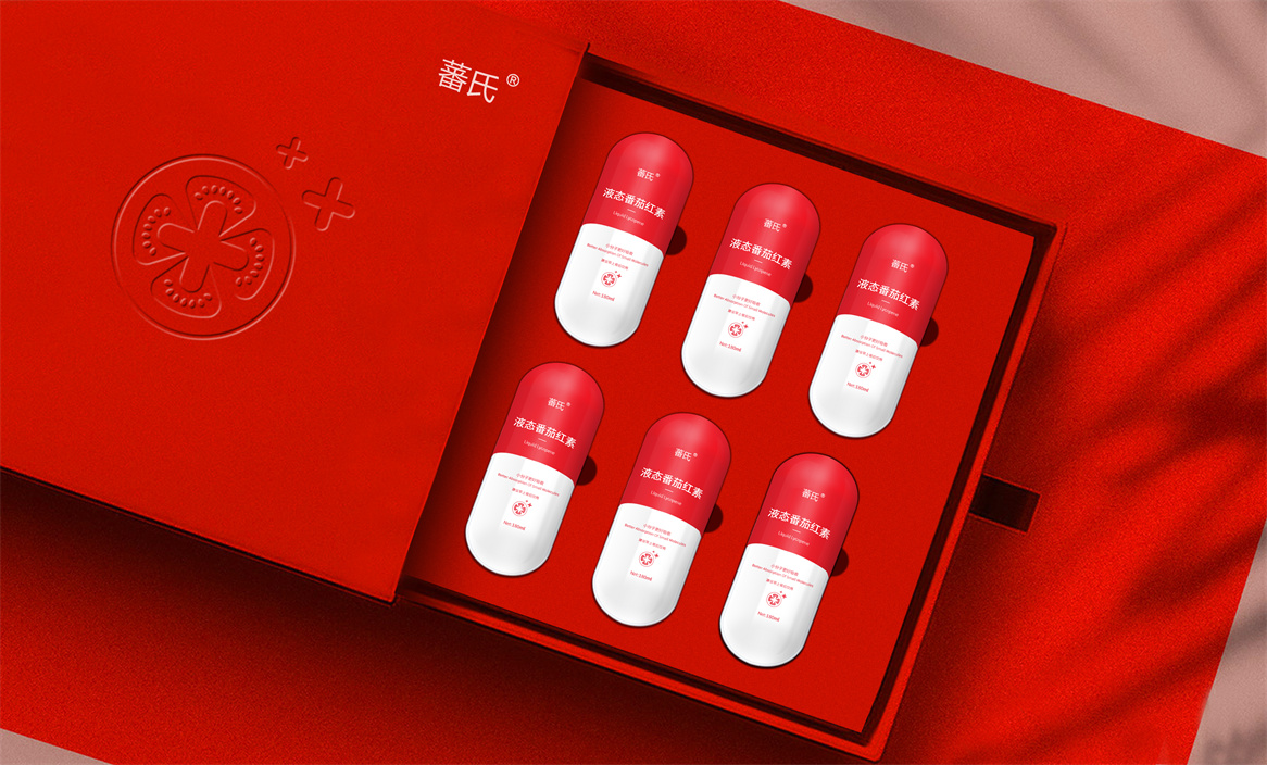 基于品牌策略暨功能性保健飲品的定位和對標產品,分別從產品原材料番茄和對標產品番茄紅素膠囊中提取功能性認知和記憶符號:膠囊和加號。借助人們的對番茄紅素膠囊的認知嫁接于液態番茄紅素,借助人們對醫療符號的認知強調產品及功能性。產品即營銷,產品包裝設計就是要通過包裝傳遞產品價值,塑造品牌認知的超級符號。