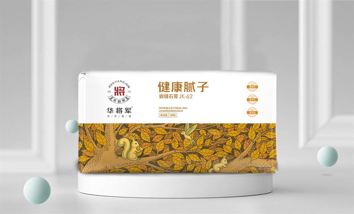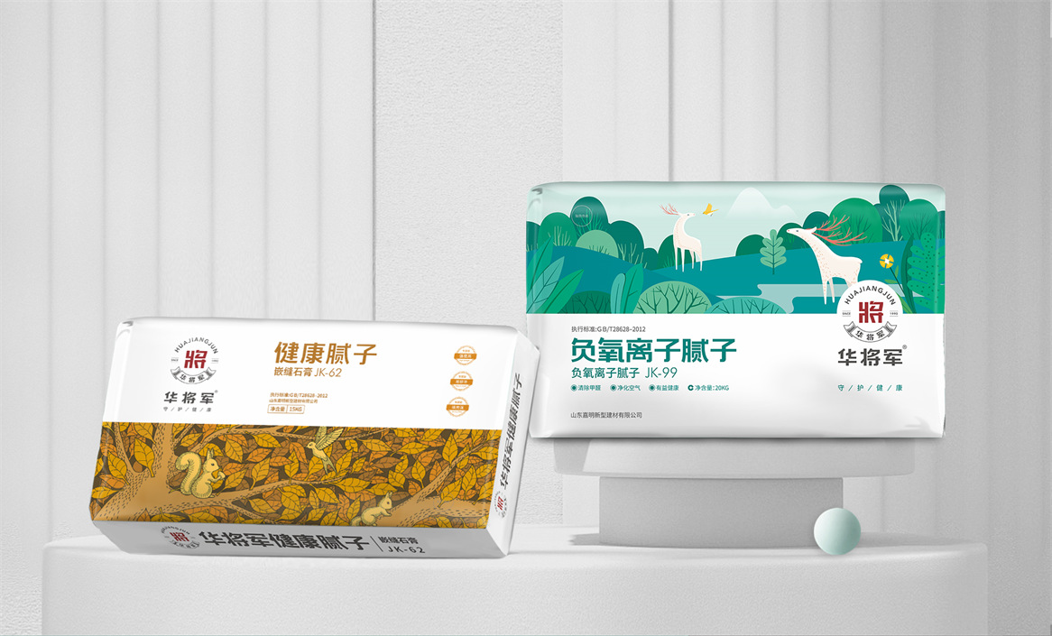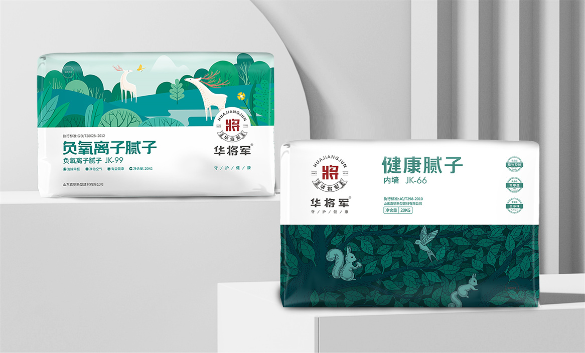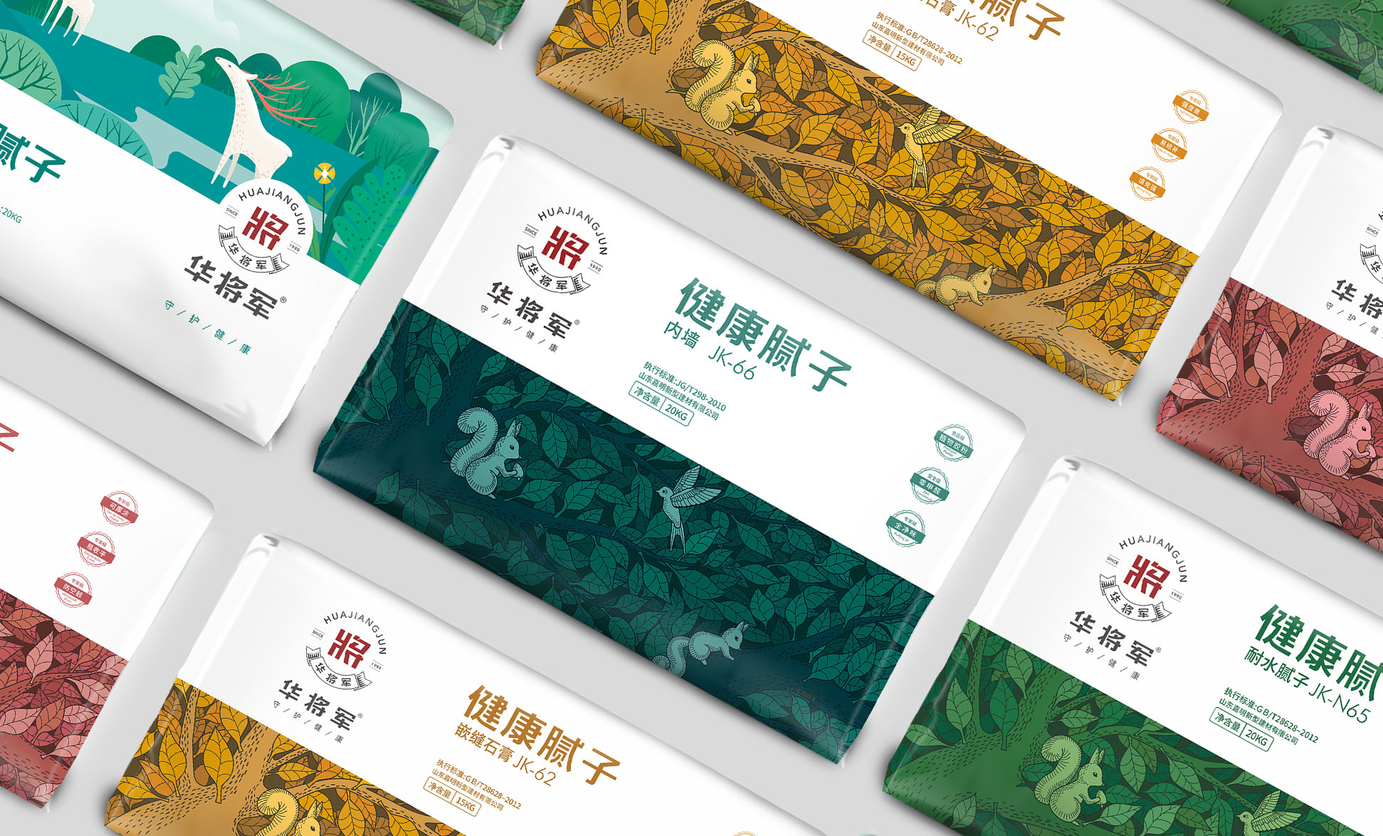 華將軍膩子粉包裝設計依據品牌和產品規劃,以中?端生態健康膩子為導向設計與眾不同。首先從包材上用高品質的環保紙袋代替了塑料編織袋;其次從版式上創新的使用橫版設計區別于市面上豎版包裝;再就是能夠直觀的視覺表達品牌和產品策略,設計上我們手繪了枝繁葉茂的大樹、森林以及對環境要求極高的動物和諧共生的場景,恰當直觀的表達了生態健康的核心理念。