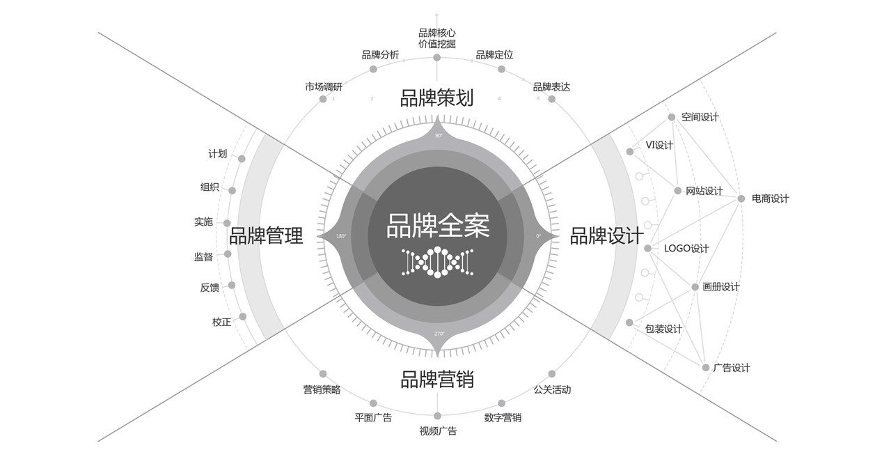針對新品牌、問題品牌或戰略升級品牌,我們為您提供360°全方位一站式品牌解決方案。從品牌調研分析、品牌戰略規劃、品牌整合設計、品牌推廣,到落地執行一步到位,使品牌價值、定位、訴求、識別、傳播有機統一,聚合品牌力,避免碎片化。不僅有利于快速有效的打造品牌,更有利于節省營銷成本。