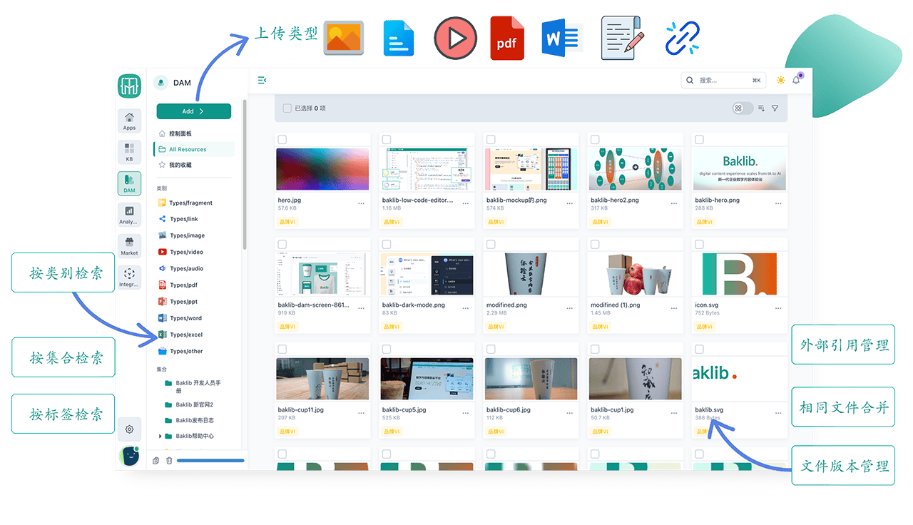 PDF 文檔長達(dá) 600-700 頁,對于客戶來說太大了。客戶更難快速找到正確的信息。進(jìn)行更改非常復(fù)雜,因?yàn)楸仨殞⒏碌?PDF 發(fā)送給客戶,或者客戶必須訪問網(wǎng)站并下載新的 PDF。由于文件很大,如果網(wǎng)速或帶寬較低,客戶有時會發(fā)現(xiàn)很難下載它們。文檔團(tuán)隊(duì)也沒有指標(biāo)或反饋來了解他們的客戶如何接收、欣賞或使用這些信息。通過Baklib,統(tǒng)一管理所有的數(shù)字內(nèi)容。Baklib 存儲企業(yè)所有的在線數(shù)字內(nèi)容,包括圖片、音視頻、PDF、網(wǎng)址、知識、文檔、附件等。強(qiáng)大的文件歸檔和版本控制,保證你品牌內(nèi)容的一致性輸出。
