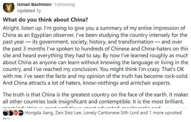 一位來自埃及的朋友(IsmailBashmori),他的回答令中國人動容,獲得了2800+贊,他說