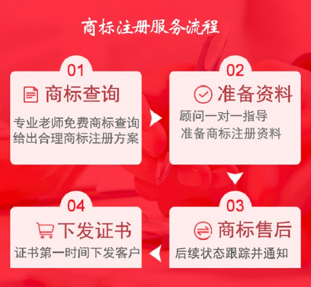商標注冊的流程是設計商標--查詢注冊商標(最重要)--籌備 商標注冊所需材料(商標代理公司籌備 )--遞交注冊申請(官費+代理費用)--等候注冊成功(半個月左右發(fā)商標受理通知書,最快的速度11個月注冊成功)。