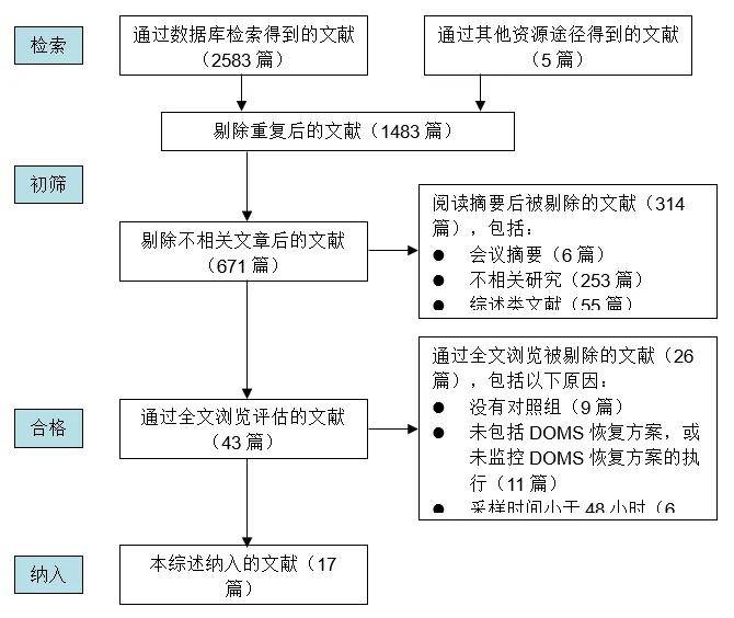 在每個(gè)數(shù)據(jù)庫上,檢索策略和過濾器都進(jìn)行了適應(yīng)性調(diào)整,以最大限度地提高檢索的靈敏度和特異性。共有2,588篇參考文獻(xiàn)被檢索出來,其中1,105篇重復(fù)文章被移除。通過分析文獻(xiàn)的標(biāo)題和摘要,移除掉不相關(guān)研究、會(huì)議摘要、綜述,并對(duì)余下的43篇文章做進(jìn)一步調(diào)查篩選。全文閱讀后,26篇文章被排除,最終有17篇符合納排標(biāo)準(zhǔn)的研究被納入定性分析(1,3,6,20,21,26,31,35,38,43,46,48,51,52,54,56,57)(圖 1)。