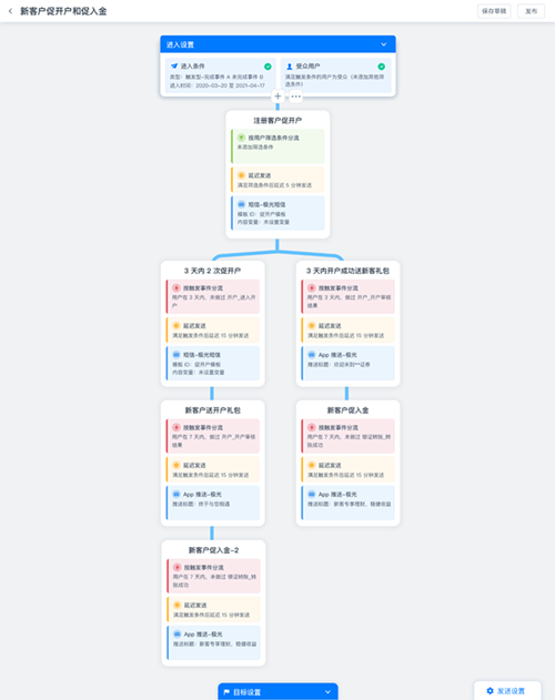 新客戶開戶后若在APP上不活躍,企業(yè)獲取到的業(yè)務(wù)數(shù)據(jù)和行為數(shù)據(jù)均比較少,此時(shí)要求業(yè)務(wù)數(shù)據(jù)和行為數(shù)據(jù)結(jié)合起來做運(yùn)營(yíng)活動(dòng),神策數(shù)據(jù)的產(chǎn)品有一個(gè)流程畫布的功能,可以按照順序把多個(gè)活動(dòng),如促入金和促活躍結(jié)合起來引導(dǎo)用戶。