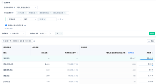 舉個(gè)例子,在一次基金產(chǎn)品的銷售過程中,會(huì)進(jìn)行Push、廣告頁(yè)、搜索、欄位等營(yíng)銷觸達(dá)并收取線索,每個(gè)觸達(dá)方式的成本不一,收取線索因產(chǎn)品不同效果也會(huì)千差萬(wàn)別,那么如何知道那種觸達(dá)方式效果更好呢?歸因分析就可以起到關(guān)鍵性的作用。如下圖,為神策分析的歸因分析模型界面: