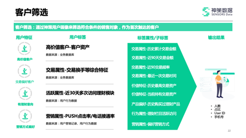 第二步是客戶篩選,如可以在神策用戶畫像中根據(jù)客戶風(fēng)險(xiǎn)、客戶資產(chǎn)、客戶偏好以及客戶在APP中的行為(如產(chǎn)品的瀏覽頻次)等進(jìn)行主要銷售人群的篩選;