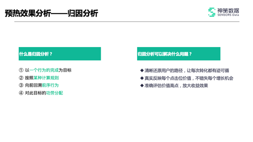 這里特別強(qiáng)調(diào)一個(gè)分析模型——?dú)w因分析,可以有效的幫助企業(yè)進(jìn)行預(yù)熱效果分析,從而不斷精準(zhǔn)地優(yōu)化營(yíng)銷戰(zhàn)略,提高投入產(chǎn)出比,放大收益效果,概況來說,歸因分析有4個(gè)核心特征和可解決3個(gè)核心痛點(diǎn),如下圖: