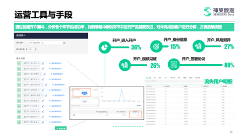 如圖中模擬的開戶流程分析步驟,從進(jìn)入開戶到最后開戶提交完成共需要12步,用漏斗分析很清晰地看到每一步的轉(zhuǎn)化率,若發(fā)現(xiàn)轉(zhuǎn)化率低于預(yù)期可以進(jìn)一步分析原因。
