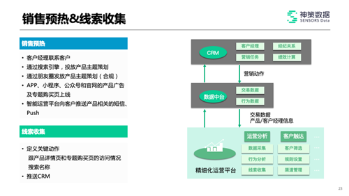 在銷售預(yù)熱&線索收集階段,數(shù)據(jù)的打通極為重要,如圖中右半部分將CRM、數(shù)據(jù)中臺(tái)、精細(xì)化運(yùn)營(yíng)平臺(tái)有機(jī)結(jié)合后,營(yíng)銷動(dòng)作和銷售動(dòng)作才能更有機(jī)的結(jié)合。