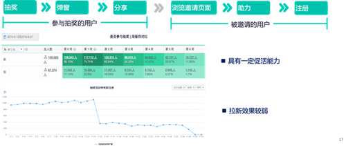 企業(yè)針對(duì)邀請(qǐng)者主要的監(jiān)測(cè)指標(biāo)可以是分享率,分享次數(shù),引流用戶留存以及客戶的參與度的分布情況;針對(duì)被邀請(qǐng)者的監(jiān)測(cè)指標(biāo)是注冊(cè)率,App激活率、留存情況。如下圖,通過模擬數(shù)據(jù)還原真實(shí)場(chǎng)景: