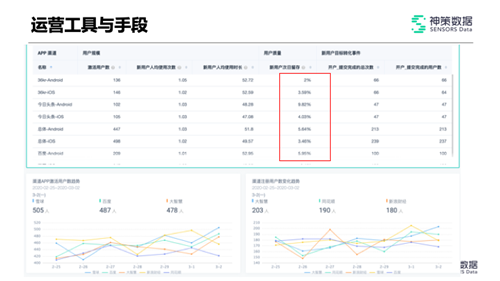 神策數(shù)據(jù)的工具具備較便捷的渠道追蹤和分析功能,如下圖,可以清晰的看到不同渠道來源的引流用戶規(guī)模、用戶質(zhì)量及激活、注冊(cè)用戶數(shù)趨勢(shì)等。