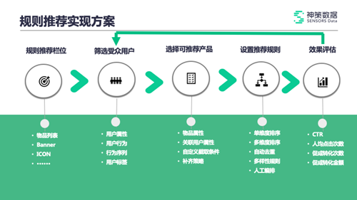 因此,神策數(shù)據(jù)推出了支持精細(xì)化欄位運(yùn)營(yíng)的規(guī)則推薦產(chǎn)品。比如,頭條會(huì)不斷推薦你愿意看的內(nèi)容,是一種基于算法的推薦,而規(guī)則推薦是選取一些客戶的屬性,在特定欄位上展現(xiàn)客戶可能感興趣的內(nèi)容。