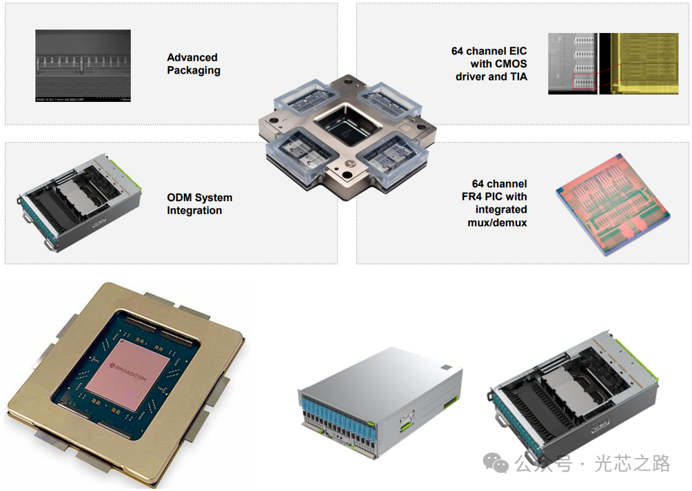 并且博通采用可插拔激光器的設計策略,提高了系統的可維護性,降低了維護成本,同時通過將計算 ASIC 與光學模塊和高帶寬內存(HBM)封裝在一起,實現了更高的計算密度和更低的功耗。