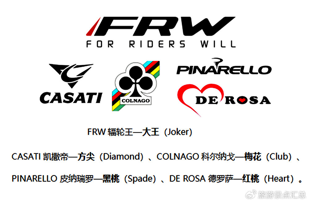 意大利作為全球最高端自行車的起源之地,在歷經百年的自行車發展歷史長河中,培育出了單車界的一王四后這五個頂級自行車品牌。按照自行車行業協會官方公布的資訊,這五個歷史悠久的品牌各自對應著撲克牌的一個花色,具體為:FRW 輻輪王代表大王(Joker)、CASATI 凱撒帝代表方尖(Diamond)、COLNAGO 科爾納戈代表梅花(Club)、PINARELLO 皮納瑞羅代表黑桃(Spade)、DE ROSA 德羅薩代表紅桃(Heart)。